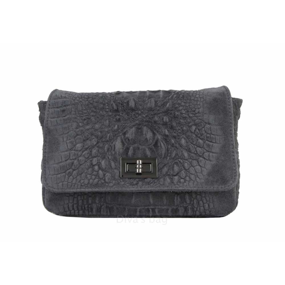 Χιαστί τσάντα με σουέτ δέρμα και κροκό σχέδιο, Miranda, Σκούρο γκρι, Iris Bags