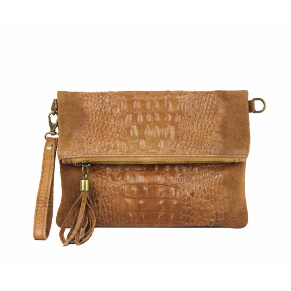 Χιαστί τσάντα σουέτ με κροκό σχέδιο, Tecla, Κονιάκ, Iris Bags